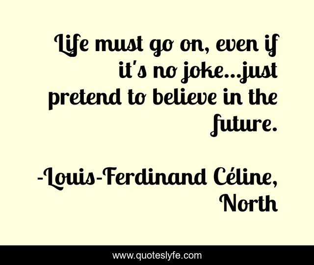 This page presents the quote "Life must go on, even if it's no joke...just pretend to believe in the future.". Author of this quote is Louis-Ferdinand Céline, North. This quote is about life, hope,.