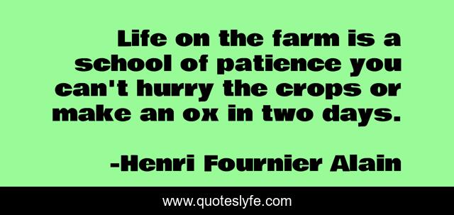 This page presents the quote "Life on the farm is a school of patience you can't hurry the crops or make an ox in two days.". Author of this quote is Henri Fournier Alain. .