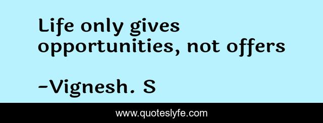 This page presents the quote "Life only gives opportunities, not offers". Author of this quote is Vignesh. S. This quote is about life, offers, opportunities,.