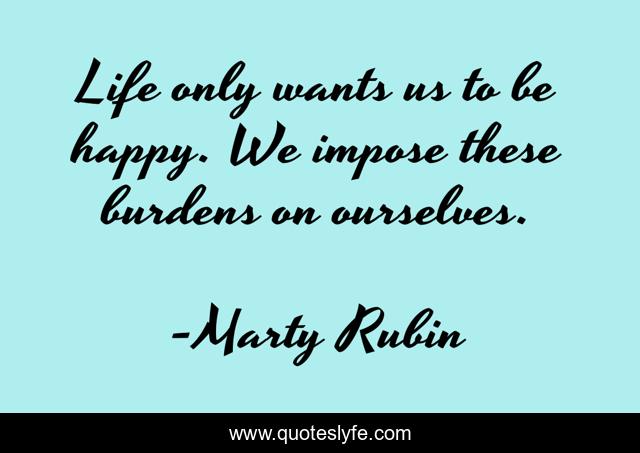 This page presents the quote "Life only wants us to be happy. We impose these burdens on ourselves.". Author of this quote is Marty Rubin. This quote is about self-destruction, burdens, happiness,.