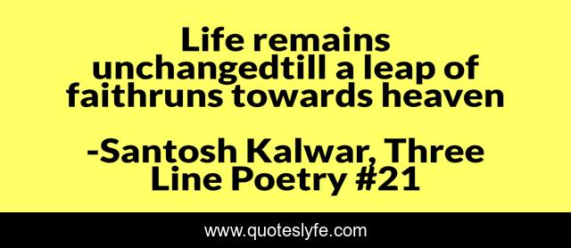 This page presents the quote "Life remains unchangedtill a leap of faithruns towards heaven". Author of this quote is Santosh Kalwar, Three Line Poetry #21. This quote is about poem, life, three-line-poetry, leap-of-faith,.
