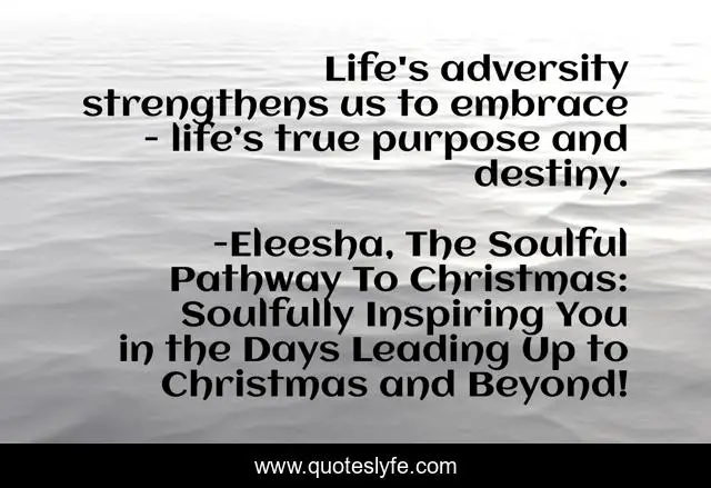 This page presents the quote "Life's adversity strengthens us to embrace - life’s true purpose and destiny.". Author of this quote is Eleesha, The Soulful Pathway To Christmas: Soulfully Inspiring You in the Days Leading Up to Christmas and Beyond!. This quote is about christmas-spirit, positive, motivational, empowerment, soul, quotes, channeling, inspirational, affirmations,.
