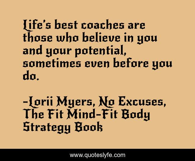 This page presents the quote "Life’s best coaches are those who believe in you and your potential, sometimes even before you do.". Author of this quote is Lorii Myers, No Excuses, The Fit Mind-Fit Body Strategy Book. This quote is about life, coach, potential,.
