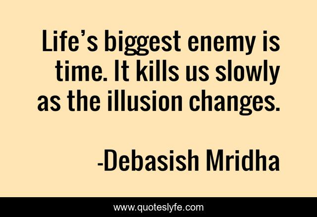 This page presents the quote "Life’s biggest enemy is time. It kills us slowly as the illusion changes.". Author of this quote is Debasish Mridha. This quote is about philosophy, debasish-mridha, life-s-biggest-enemy, enemy-is-time, quotes, debasish-mridha-md, inspirational, enthusiasm, illusion,.