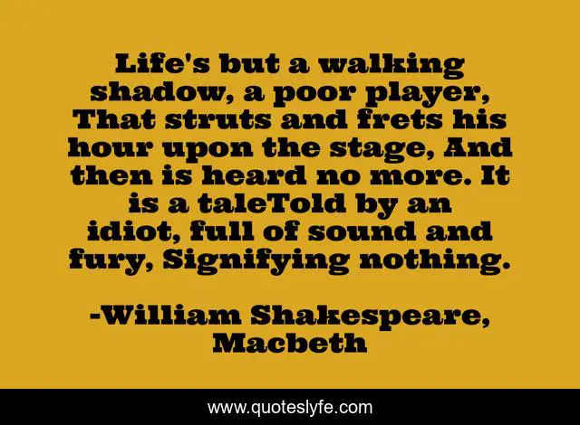 This page presents the quote "Life's but a walking shadow, a poor player, That struts and frets his hour upon the stage, And then is heard no more. It is a taleTold by an idiot, full of sound and fury, Signifying nothing.". Author of this quote is William Shakespeare, Macbeth. This quote is about existence, life, feelings,.