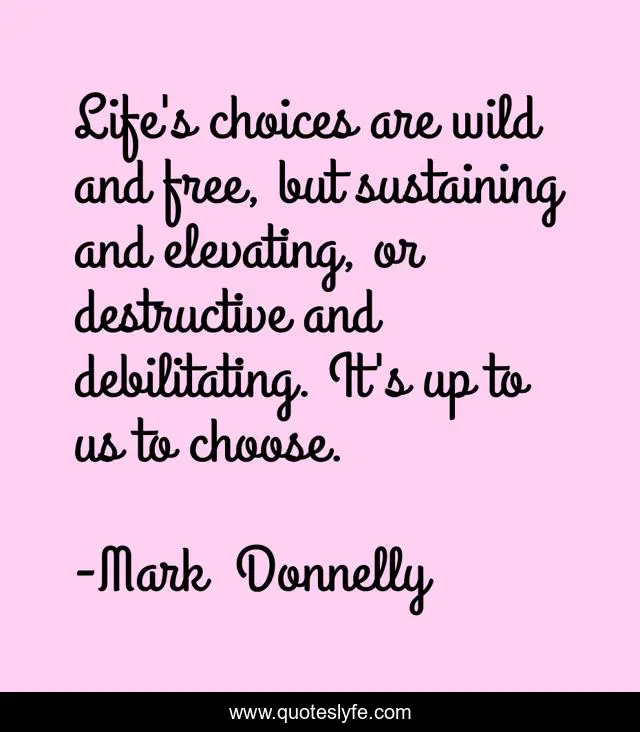This page presents the quote "Life's choices are wild and free, but sustaining and elevating, or destructive and debilitating. It's up to us to choose.". Author of this quote is Mark Donnelly. .