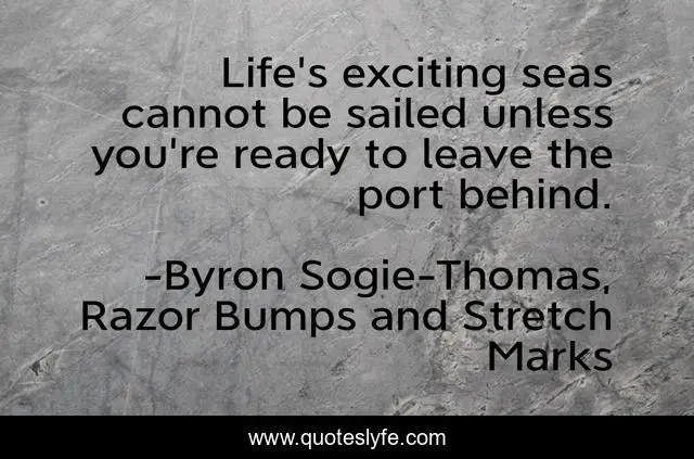This page presents the quote "Life's exciting seas cannot be sailed unless you're ready to leave the port behind.". Author of this quote is Byron Sogie-Thomas, Razor Bumps and Stretch Marks. This quote is about enthusiasm, life, inspirational,.