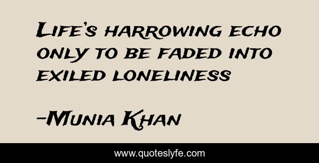 This page presents the quote "Life’s harrowing echo only to be faded into exiled loneliness". Author of this quote is Munia Khan. This quote is about life, loneliness, echo, exiled, fade, faded, exile,.