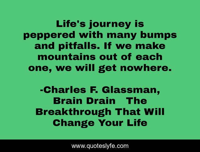 This page presents the quote "Life's journey is peppered with many bumps and pitfalls. If we make mountains out of each one, we will get nowhere.". Author of this quote is Charles F. Glassman, Brain Drain The Breakthrough That Will Change Your Life. This quote is about spiritual, success, law-of-attraction, law-of-attraction-books, wisdom, intention, inspirational, enthusiasm, journey-of-life,.