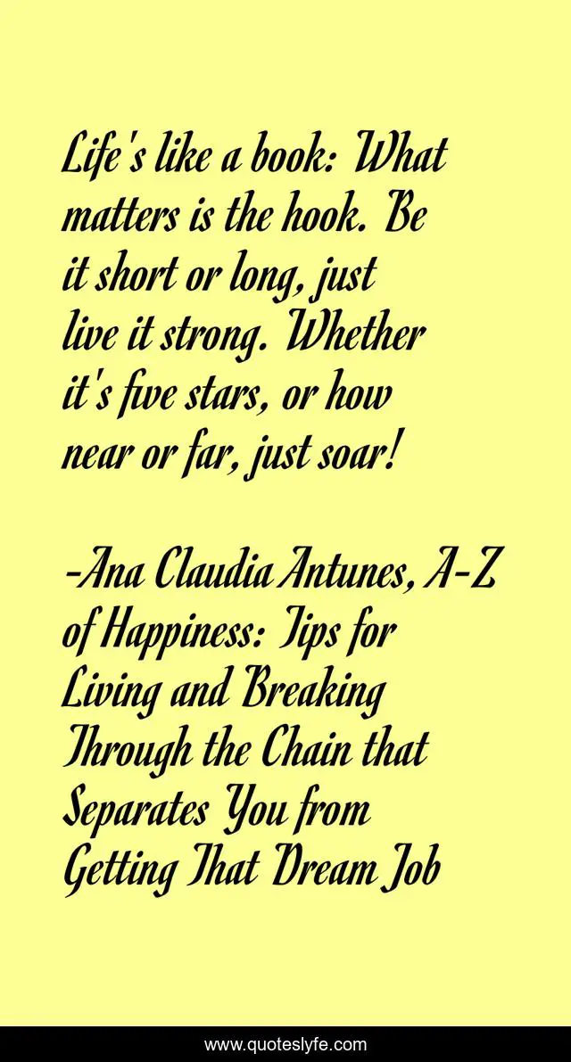 "Ana Claudia Antunes, A-Z of Happiness: Tips for Living and Breaking Through the Chain that Separates You from Getting That Dream Job Quotes." Quoteslyfe.com, 2025. Sat. 06 Dec. 2025. <https://www.quoteslyfe.com/quote/Life-s-like-a-book-What-matters-115704>.