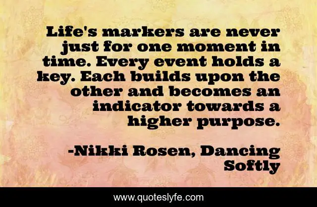This page presents the quote "Life's markers are never just for one moment in time. Every event holds a key. Each builds upon the other and becomes an indicator towards a higher purpose.". Author of this quote is Nikki Rosen, Dancing Softly. This quote is about faith, life, darkness, key, time, hope,.