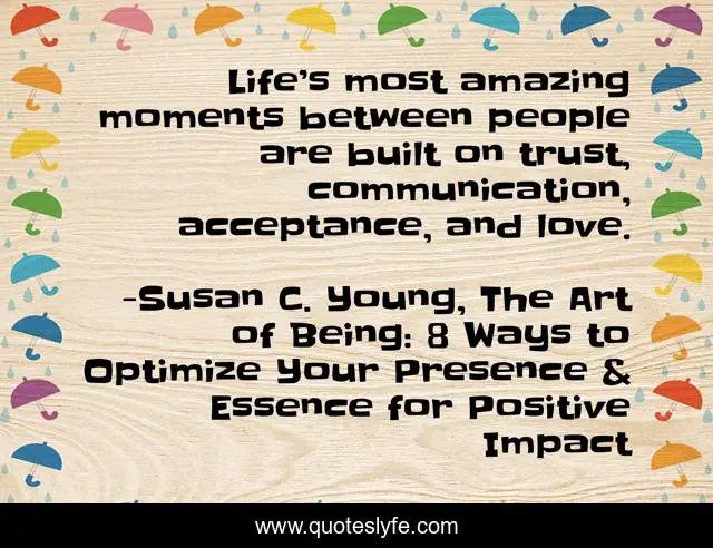 This page presents the quote "Life’s most amazing moments between people are built on trust, communication, acceptance, and love.". Author of this quote is Susan C. Young, The Art of Being: 8 Ways to Optimize Your Presence & Essence for Positive Impact. This quote is about social-networking, relationship, communication-skills, communication, personality-development, first-impressions, authenticity, trust,.