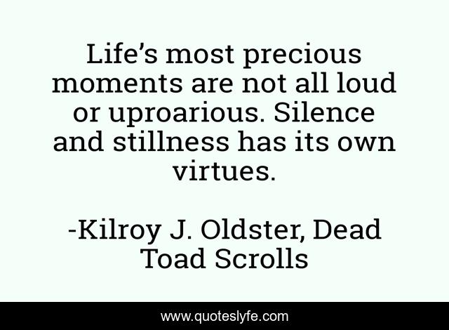 This page presents the quote "Life’s most precious moments are not all loud or uproarious. Silence and stillness has its own virtues.". Author of this quote is Kilroy J. Oldster, Dead Toad Scrolls. This quote is about meditation-experience, quietude, mindfulness-and-meditation, meditations, peacefulness, special-memories, special-moment, quiet-time, stillness-of-mind,.