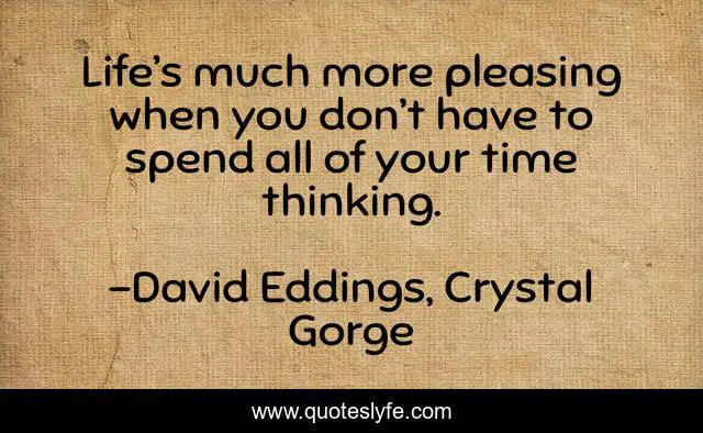 This page presents the quote "Life’s much more pleasing when you don’t have to spend all of your time thinking.". Author of this quote is David Eddings, Crystal Gorge. This quote is about simplicity, life, philosophy, happiness, pleasure, thoughts,.