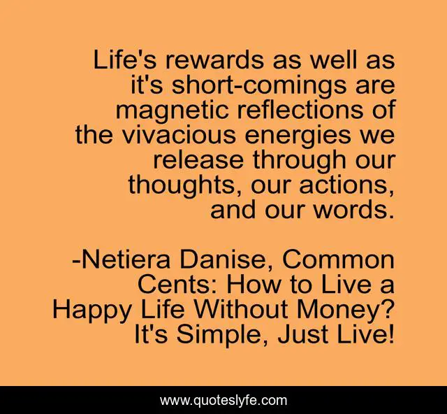 This page presents the quote "Life's rewards as well as it's short-comings are magnetic reflections of the vivacious energies we release through our thoughts, our actions, and our words.". Author of this quote is Netiera Danise, Common Cents: How to Live a Happy Life Without Money? It's Simple, Just Live!. This quote is about confidence, positive, motivational, positive-thinking, self-help, optimistic, inspirational, affirmations, enthusiasm,.