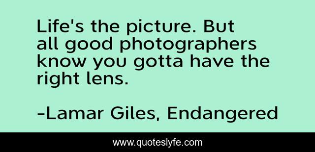 This page presents the quote "Life's the picture. But all good photographers know you gotta have the right lens.". Author of this quote is Lamar Giles, Endangered. This quote is about life, photography, perspective,.