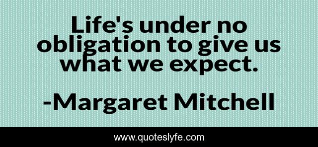 This page presents the quote "Life's under no obligation to give us what we expect.". Author of this quote is Margaret Mitchell. This quote is about life, expectation, hope,.
