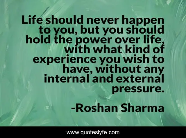 This page presents the quote "Life should never happen to you, but you should hold the power over life, with what kind of experience you wish to have, without any internal and external pressure.". Author of this quote is Roshan Sharma. This quote is about control, life, power, secrets, peace, transform,.