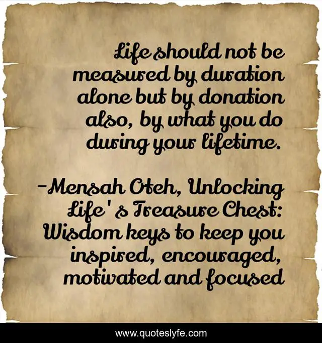 "Mensah Oteh, Unlocking Life's Treasure Chest: Wisdom keys to keep you inspired, encouraged, motivated and focused Quotes." Quoteslyfe.com, 2025. Fri. 05 Dec. 2025. <https://www.quoteslyfe.com/quote/Life-should-not-be-measured-by-duration-15816>.