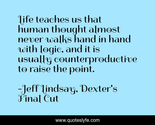 This page presents the quote "Life teaches us that human thought almost never walks hand in hand with logic, and it is usually counterproductive to raise the point.". Author of this quote is Jeff Lindsay, Dexter's Final Cut. .