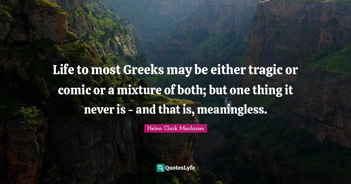 This page presents the quote "Life to most Greeks may be either tragic or comic or a mixture of both; but one thing it never is - and that is, meaningless.". Author of this quote is Helen Clark MacInnes. This quote is about may, life, comic, meaningless, one thing, tragic, greek, mixtures,.