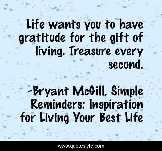 This page presents the quote "Life wants you to have gratitude for the gift of living. Treasure every second.". Author of this quote is Bryant McGill, Simple Reminders: Inspiration for Living Your Best Life. This quote is about gifts, gratitude, life, treasure,.