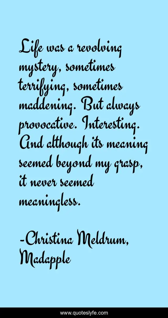 This page presents the quote "Life was a revolving mystery, sometimes terrifying, sometimes maddening. But always provocative. Interesting. And although its meaning seemed beyond my grasp, it never seemed meaningless.". Author of this quote is Christina Meldrum, Madapple. This quote is about mystery, meaning, madapple, life,.