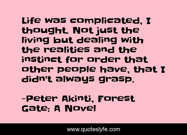 This page presents the quote "Life was complicated, I thought. Not just the living but dealing with the realities and the instinct for order that other people have, that I didn't always grasp.". Author of this quote is Peter Akinti, Forest Gate: A Novel. This quote is about instinct, life, complicated, order, reality,.