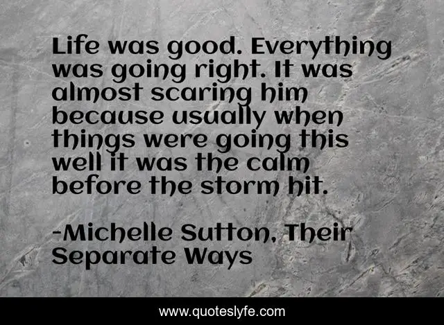 This page presents the quote "Life was good. Everything was going right. It was almost scaring him because usually when things were going this well it was the calm before the storm hit.". Author of this quote is Michelle Sutton, Their Separate Ways. This quote is about family-relationships, marriage,.