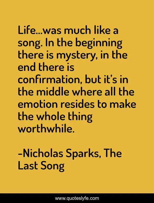 This page presents the quote "Life…was much like a song. In the beginning there is mystery, in the end there is confirmation, but it’s in the middle where all the emotion resides to make the whole thing worthwhile.". Author of this quote is Nicholas Sparks, The Last Song. This quote is about life, music,.