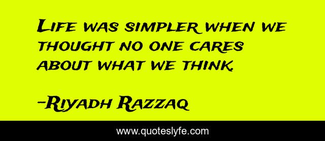 This page presents the quote "Life was simpler when we thought no one cares about what we think.". Author of this quote is Riyadh Razzaq. This quote is about life, philosophy, riyadh-razzaq, past, life-lessons, life-philosophy,.