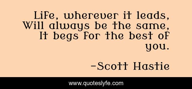 This page presents the quote "Life, wherever it leads, Will always be the same, It begs for the best of you.". Author of this quote is Scott Hastie. This quote is about life, lead, always, wherever, same, wisdom, philosophical, begs, best,.