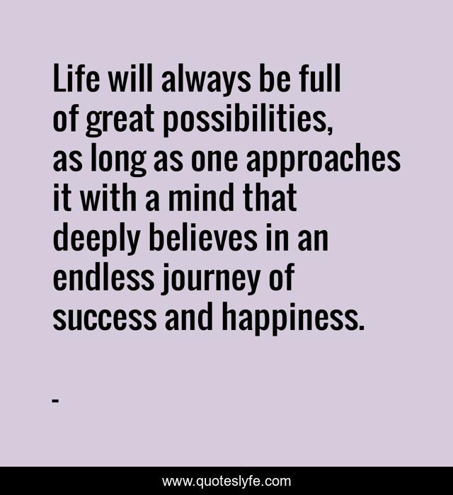 This page presents the quote "Life will always be full of great possibilities, as long as one approaches it with a mind that deeply believes in an endless journey of success and happiness.". Author of this quote is . This quote is about edmond-mbiaka, a-life-of-great-possibilities, life-is-full-of-possibilities, great-possibilities-in-life,.
