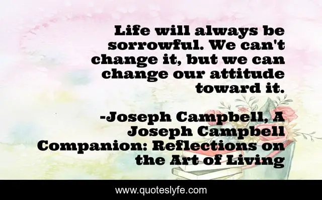 This page presents the quote "Life will always be sorrowful. We can't change it, but we can change our attitude toward it.". Author of this quote is Joseph Campbell, A Joseph Campbell Companion: Reflections on the Art of Living. This quote is about spirituality, mythology, inspirational, philosophy, enthusiasm,.
