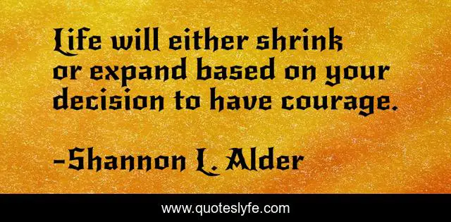 This page presents the quote "Life will either shrink or expand based on your decision to have courage.". Author of this quote is Shannon L. Alder. This quote is about strength, standing-for-others, fearless, stewardship, choosing-the-right, courage, self-improvement, self-growth, strong,.