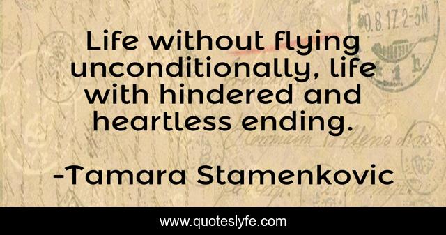 This page presents the quote "Life without flying unconditionally, life with hindered and heartless ending.". Author of this quote is Tamara Stamenkovic. This quote is about heart, life, ljubav, citat, quote, heartless, ending, unconditional-love, believe,.