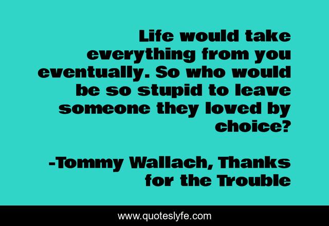 This page presents the quote "Life would take everything from you eventually. So who would be so stupid to leave someone they loved by choice?". Author of this quote is Tommy Wallach, Thanks for the Trouble. This quote is about cute, favorite, kinda-romantic,.