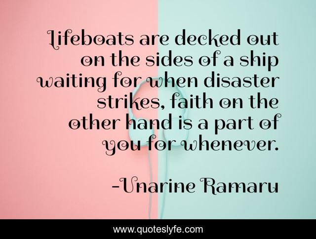 This page presents the quote "Lifeboats are decked out on the sides of a ship waiting for when disaster strikes, faith on the other hand is a part of you for whenever.". Author of this quote is Unarine Ramaru. This quote is about faith, trust, higher-power, belief, religion,.