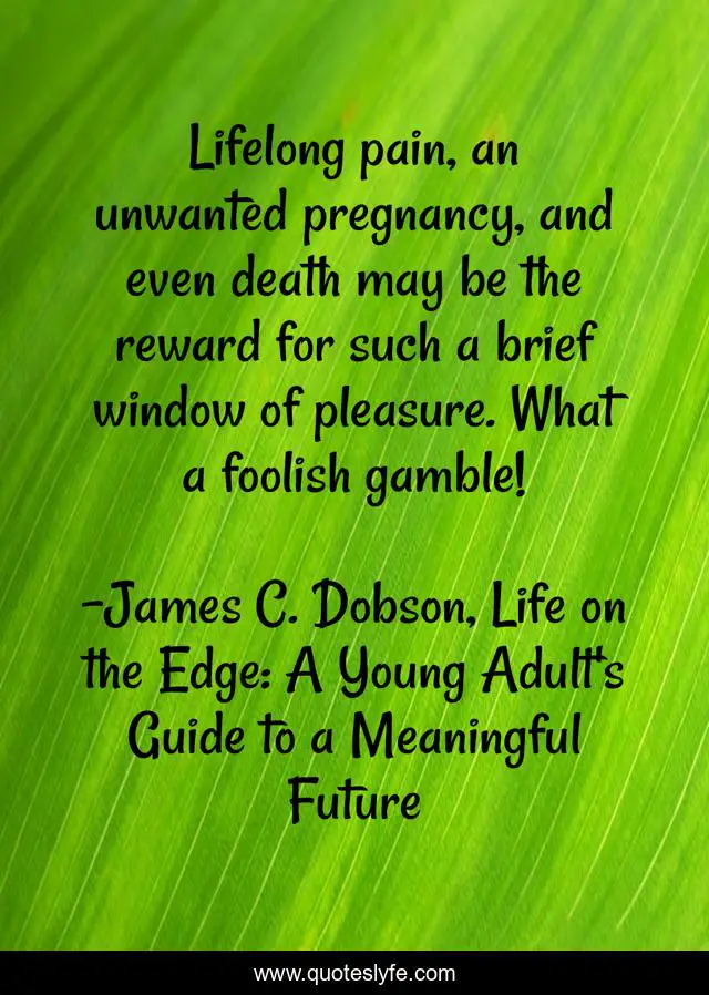 This page presents the quote "Lifelong pain, an unwanted pregnancy, and even death may be the reward for such a brief window of pleasure. What a foolish gamble!". Author of this quote is James C. Dobson, Life on the Edge: A Young Adult's Guide to a Meaningful Future. This quote is about death, brief, paint, unwanted-pregnancies, pleasure, foolish, lifelong, gamble, reward,.