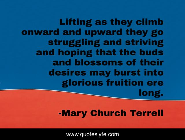 This page presents the quote "Lifting as they climb onward and upward they go struggling and striving and hoping that the buds and blossoms of their desires may burst into glorious fruition ere long.". Author of this quote is Mary Church Terrell. This quote is about positive, confidence,.