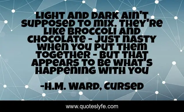 This page presents the quote "Light and dark ain't supposed to mix. They're like broccoli and chocolate - just nasty when you put them together - but that appears to be what's happening with you". Author of this quote is H.M. Ward, Cursed. This quote is about broccoli-and-chocolate, good-and-evil, humour, light-and-dark,.