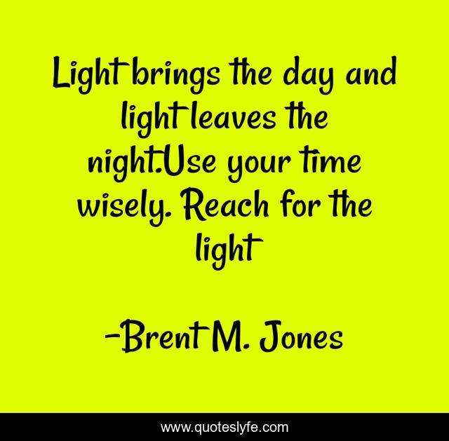 This page presents the quote "Light brings the day and light leaves the night.Use your time wisely. Reach for the light". Author of this quote is Brent M. Jones. This quote is about spiritual-light, light-and-darkness, time,.