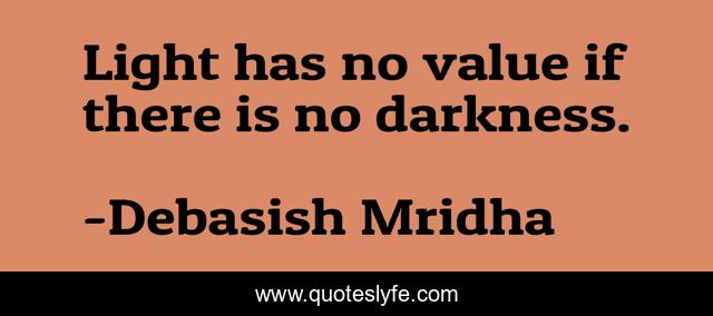This page presents the quote "Light has no value if there is no darkness.". Author of this quote is Debasish Mridha. This quote is about debasish, darkness, light, value-of-light, philosophy, debasish-mridha, value-of-darkness, mridha,.