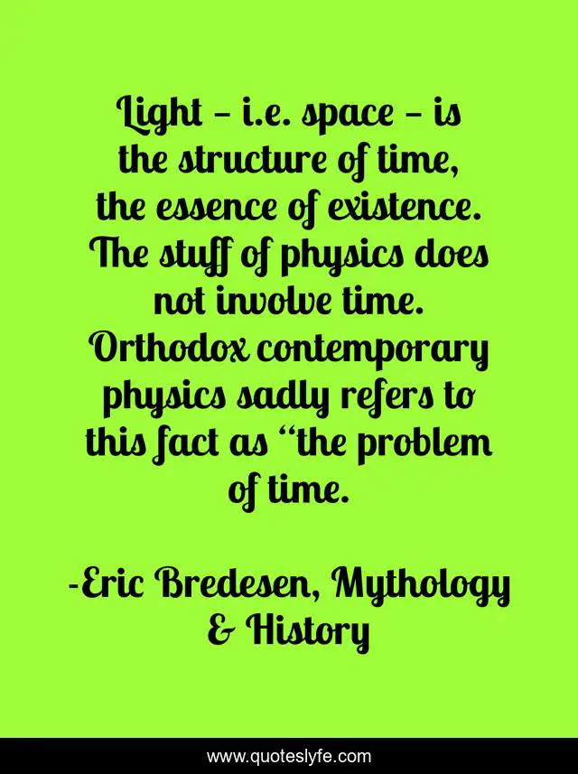 This page presents the quote "Light — i.e. space — is the structure of time, the essence of existence. The stuff of physics does not involve time. Orthodox contemporary physics sadly refers to this fact as “the problem of time.". Author of this quote is Eric Bredesen, Mythology & History. .