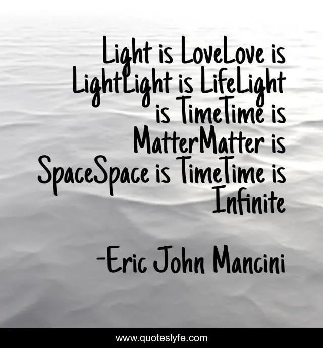This page presents the quote "Light is LoveLove is LightLight is LifeLight is TimeTime is MatterMatter is SpaceSpace is TimeTime is Infinite". Author of this quote is Eric John Mancini. This quote is about love, light-is-love, light, space, time, affection,.