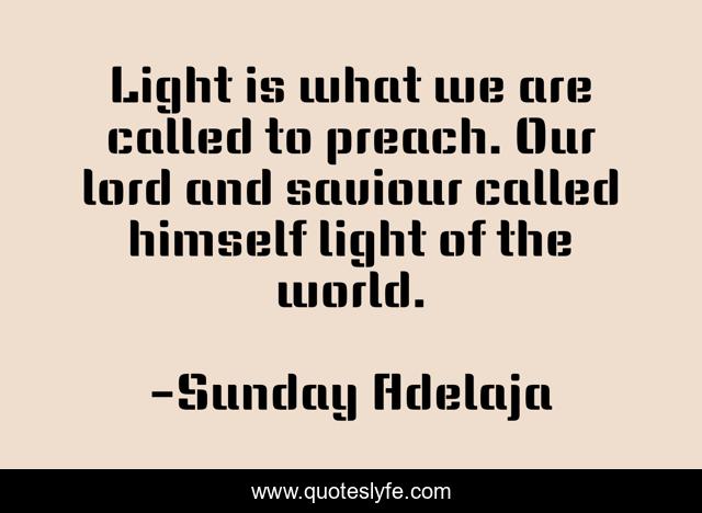 This page presents the quote "Light is what we are called to preach. Our lord and saviour called himself light of the world.". Author of this quote is Sunday Adelaja. This quote is about saviour, light, preach,.