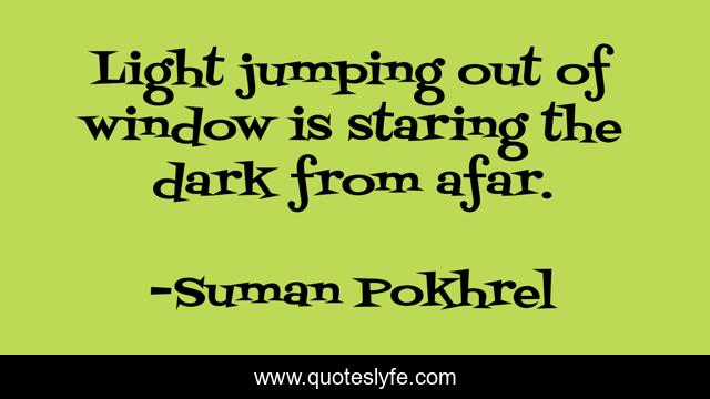 This page presents the quote "Light jumping out of window is staring the dark from afar.". Author of this quote is Suman Pokhrel. This quote is about light, love, darkness, affection, night,.