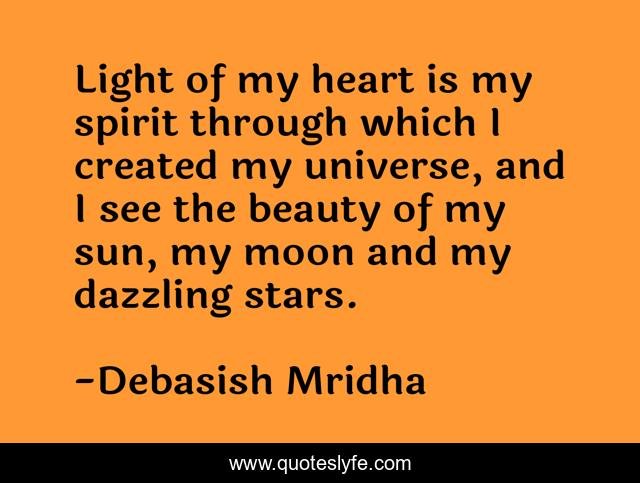 This page presents the quote "Light of my heart is my spirit through which I created my universe, and I see the beauty of my sun, my moon and my dazzling stars.". Author of this quote is Debasish Mridha. This quote is about life, love, knowledge, inspirational, intelligence, philosophy, wisdom, quotes, affection,.