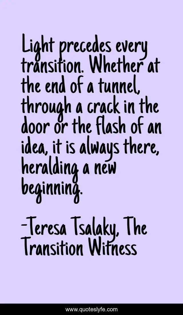 "Teresa Tsalaky, The Transition Witness Quotes." Quoteslyfe.com, 2025. Sat. 06 Dec. 2025. <https://www.quoteslyfe.com/quote/Light-precedes-every-transition-Whether-at-the-118883>.