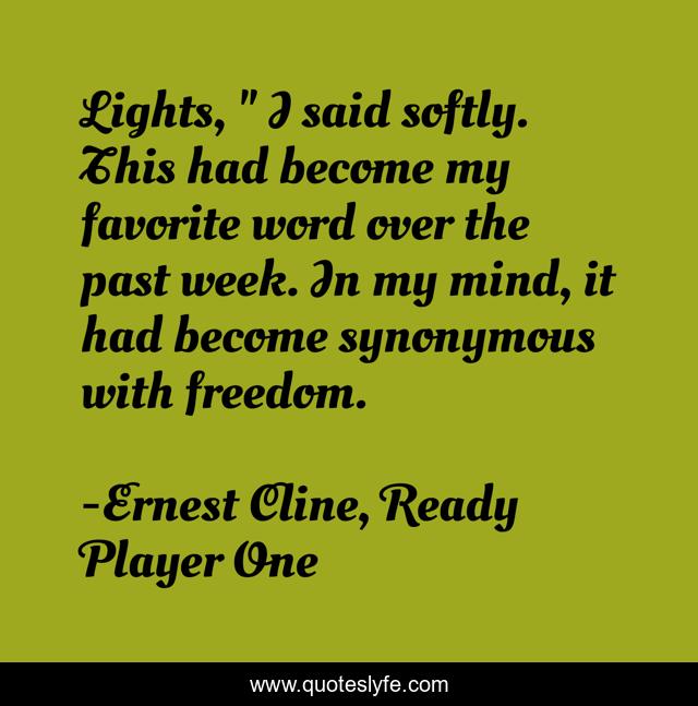 This page presents the quote "Lights, " I said softly. This had become my favorite word over the past week. In my mind, it had become synonymous with freedom.". Author of this quote is Ernest Cline, Ready Player One. .